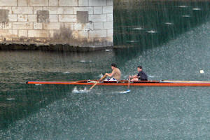 Čas kasnije, dolje na Neretvi, „uhvatili“ smo dva mlada veslača VK Neretvanski gusar kako hitaju put hangara na vrh Unke. Na čas su se od kiše pokušali skriti  pod Lučkim mostom, ali su, vidjevši da su već mokri, hrabro nastavili uzvodno.