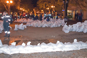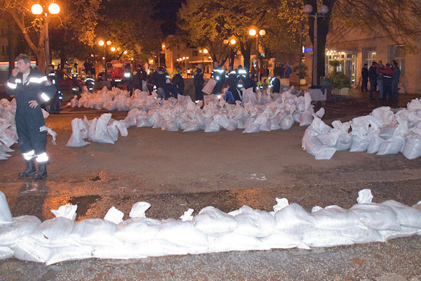 Na lijevoj strani grada pripreme su za moguće izlijevanje Neretve jer kruže svakakve informacije. U glavnoj ulici voda je počela izbijati kroz slivnike na koje su stavljene vreće s pijeskom. Na Trgu kralja Tomislava pedesetak vatrogasaca iz cjele županije puni vreće s pijeskom pokušavajući napraviti zečji nasip. Vjerojatno je to uzaludan posao ako dođe do najgorega jer se duljina obale mjeri kilometrima.