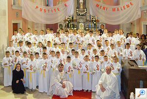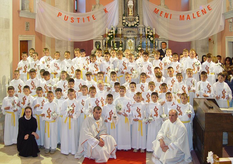 Metković, 9.5.2004. - Danas je u župi Sv. Ilije preko 130 djece primilo sakrament Prve svete pričesti. U prepunoj crkvi misno slavlje predvodio je župski vikar fra Ivica Erceg uz koncelebraciju župnika fra Dušana Džinbega.