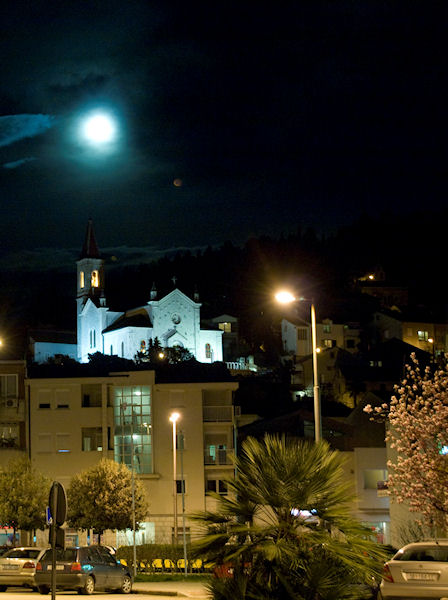 19.3.2011. - Večeras je pun Mjesec, ali i najbliži Zemlji u posljednjih nekoliko godina pa je zbog toga svjetliji i prividno veći. Vjerojatno su ga mnogi večeras pokušali fotografirati, što baš i nije lako. Urane li ujutro imaju „popravni“. Mi smo ga sačekali kada je povirio nad Predolcem te koji minut kasnije kada je odskočio nad kampanjel Sv. Ilije.