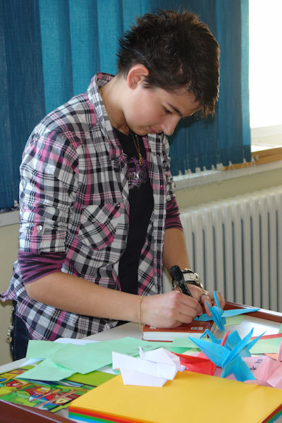 Papirnati ždralovi izrađuju se u školskoj knjižnici gdje smo zatekli skupinu srednjoškolaca među kojima je ovaj put najvažniju ulogu imala Stefani Majčica koja je na izrađene ždralove ispisivala Japan i mi na japanskom čije je osnove uspjela djelomično savladati gledajući japanske crtiće.