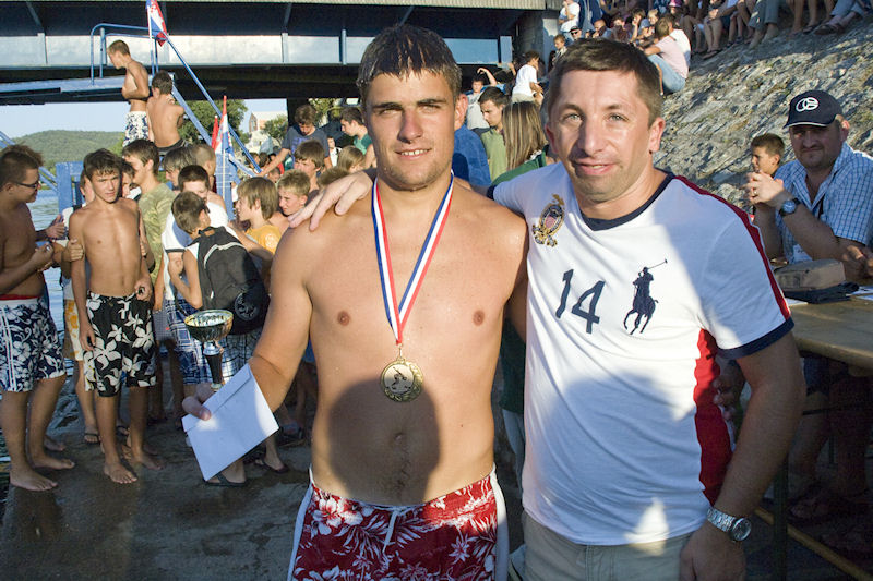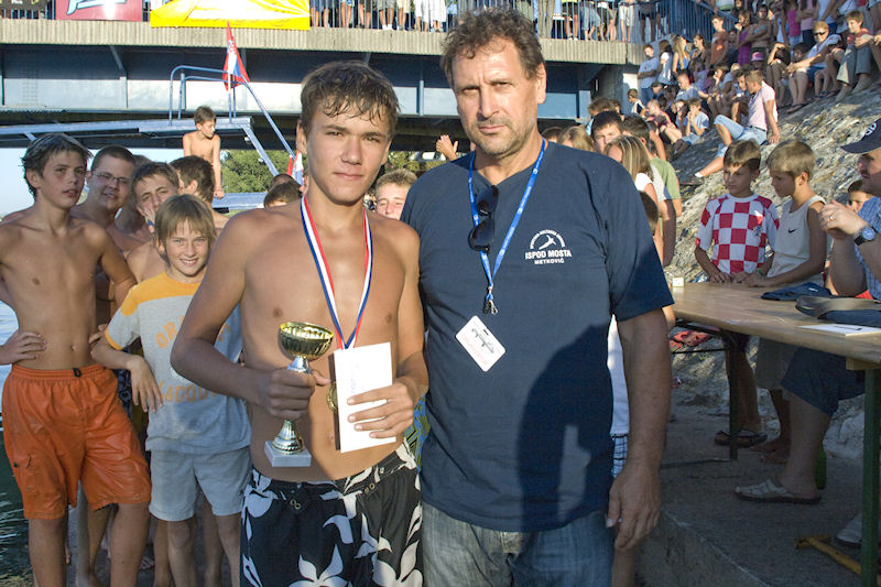 Metković, 18.7.2011. - Jučer su na Neretvi podno Lučkoga mosta održani 8. skokovi u Neretvu, natjecanje koje svake godine pred Svetoga Iliju privuče veliku pozornost. Natjecalo se u tri kategorije; odrasli, mladež i žene. U najtežoj pobjednik je bio Duje Gligorov kojemu je pehar i novčanu nagradu od 1000 kn uručio predsjednik Udruge Ispod mosta Ivica Arapović