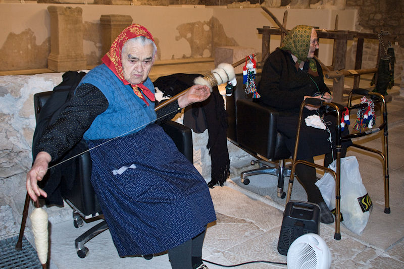 Penjem se uskim stubama i na pločniku pred hramom zatječem prizor kao pred bankom s janjetinom na Gospu Ledenu. Moraš se gotovo laktati. S galerije se čuju tamburice. To članovi tamburaške sekcije KUD-a Metković svemu daju domaći štih. Silazim ponovno pred Augustej. U prostoru nesuđenoga muzejskog kafića postavljena je etnografska izložba na temu neretvanske torbe, kakvih se (Bogu hvala) u Vidu nađe još podosta. Tu su i greben i gargaše, preslica i vreteno... Ali prava atrakcija bile su dvije vidonjske bake koje su demonstrirale vještine što padaju u zaborav. Vjerojatno se vještina kukičanja neće tako lako izgubiti, mada baš i nisam siguran u to, ali predenje vune je nešto što se žurno treba prenijeti na nove naraštaje. Najbolje je preskočiti i djecu i unuke i prenijeti to na praunuke. Samo, gdje još naći vune?