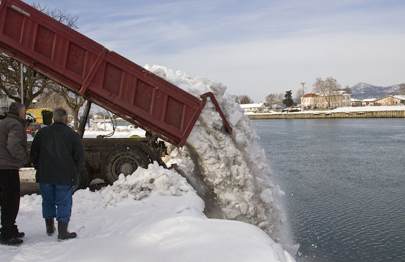 Novo snijeg mogao bi donijeti i nove probleme s odvijanjem nastave. Da bi ona što proje počela oko škola čisti se snijeg i kamionima odvozi u Neretvu. Za ilustraciju, u veliki kamion s naše fotografije stalo je snijega s 50 metara četvornih površine.