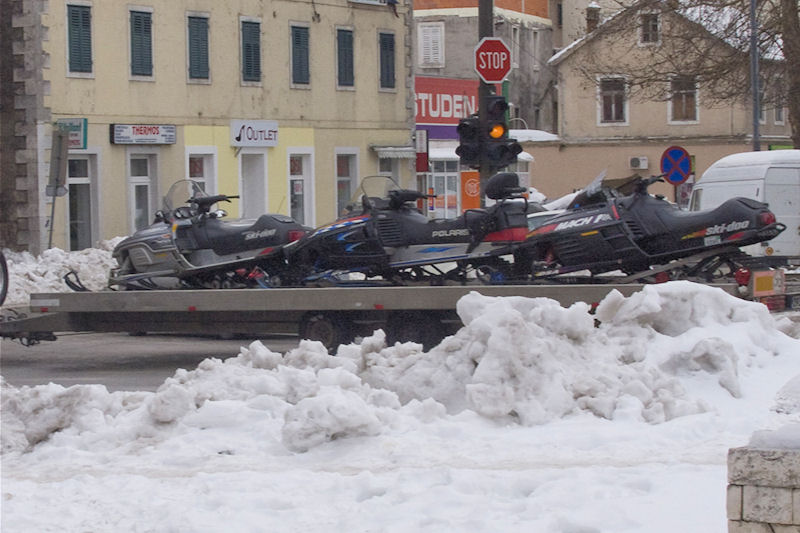 Danas smo kraj mosta uhvatili zanimljiv prizor gdje automobil na dugačkoj prikolici vuče troje motorne sanjke. Krenuo je lijevo prema granici na Doljanima. Izgleda da je situacija s lokalnim putovima u BiH jako loša pa su sanjke jedino moguće prijevozno sredstvo. U to smo se djelomično i sami danas uvjerili kada smo pošli do Ljubuškoga. Razlog tomu je bio što se tamo na Kerametalovoj benzinskoj crpki mogu kupiti drveni briketi za loženje. Cijena je oko 15 kn za jedan pak od četiri briketa. Put do graničnog prijelaza Prud je potpuno čist i suh, ali čim se prijeđe granica put do Ljubuškoga je pod snijegom pa treba imati lance.
