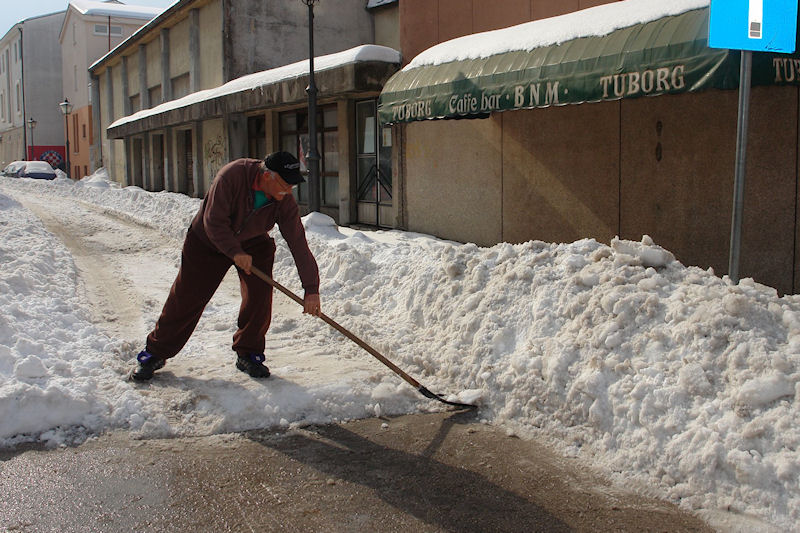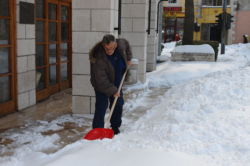Da bismo večeras dobili stanje kao na gornjoj fotografiji trebalo je odvesti 13 velikih kamiona snijega (oko 250 prostornih metara) sa samo pedesetak metara početka Ulice Ante Starčevića. U čišćenje ulica koje imaju status županijskih cesta uključila se Županijska uprava za ceste i to je dalo rezultate. Sve to pratili su i građani pa je grad večeras, barem dobrim dijelom, prohodan.