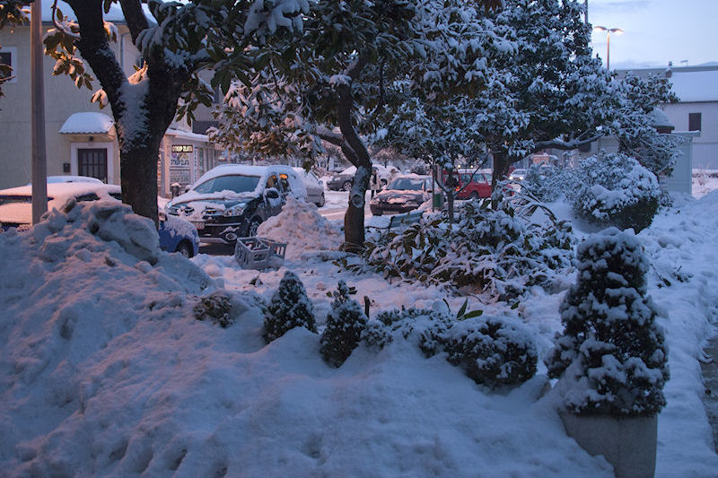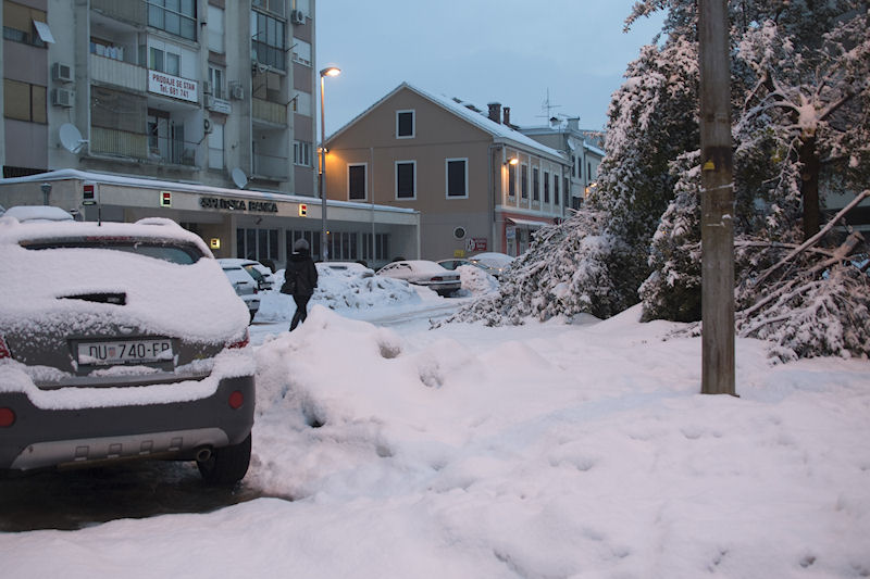 Mi smo u šest već bili vani. Temperatura je bila nešto ispod nule (-1ºC u 7 sati), a glavne prometnice bile su očišćene. Zanimljivo je da je debljina snježnoga pokrivača (tamo gdje je nedirnut) 46 cm. Iako se oko osam sati nebo čini još snježnim, danas bi moglo biti sunca, a noćas opet deblji minus.