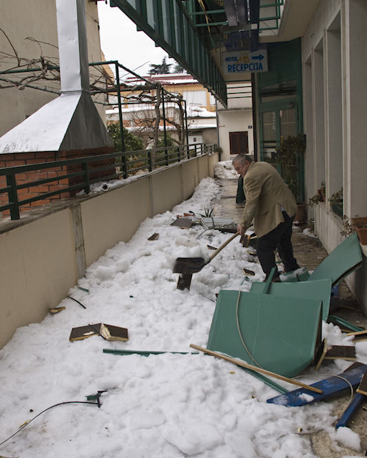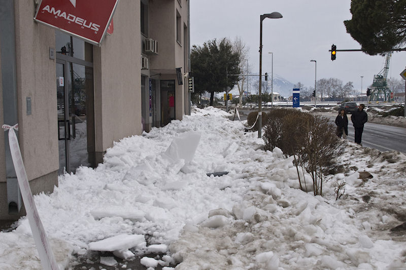 Metković, 19.2.2012. - Noćas nije bilo temperaturnoga minusa pa se snijeg topio i padao s krovova. Koliko znamo, nitko nije stradao, ali je bilo štete. Prognoziraju nam danas i sutra kišu, što će još više otežati snijeg na krovovima pa se čuvajte.