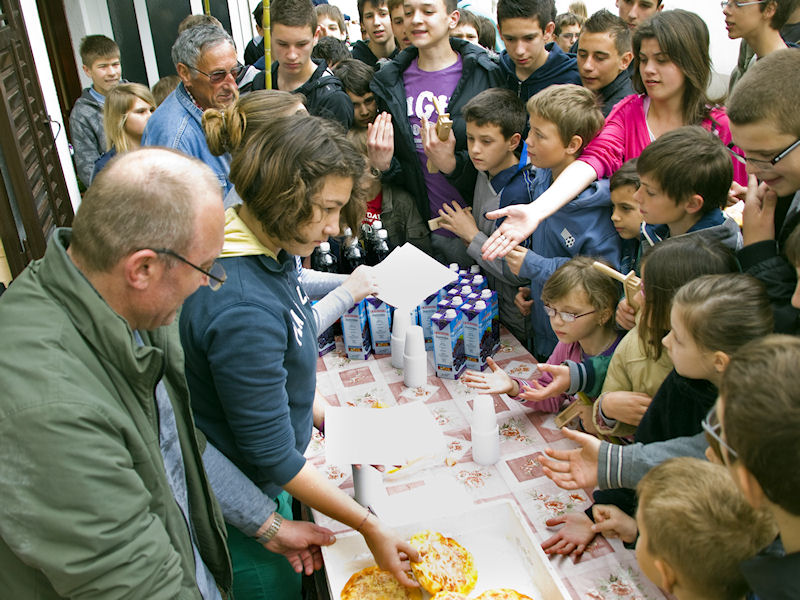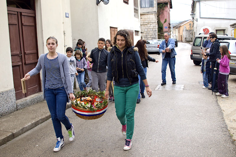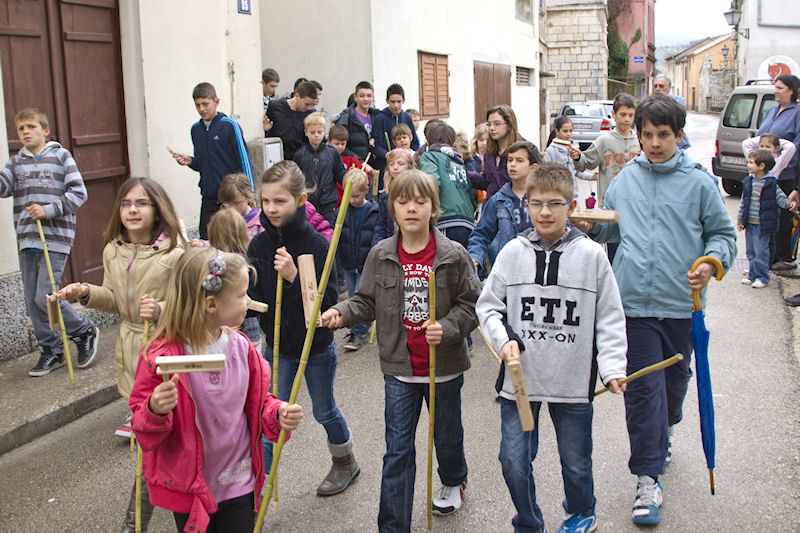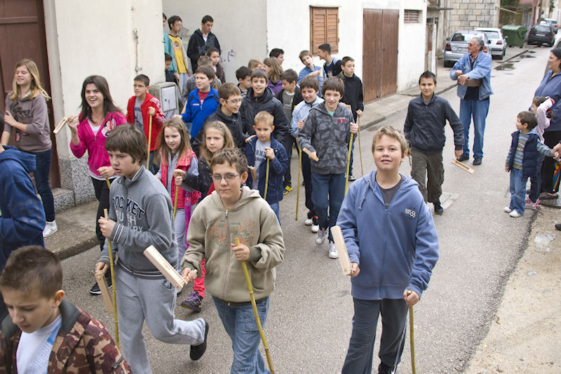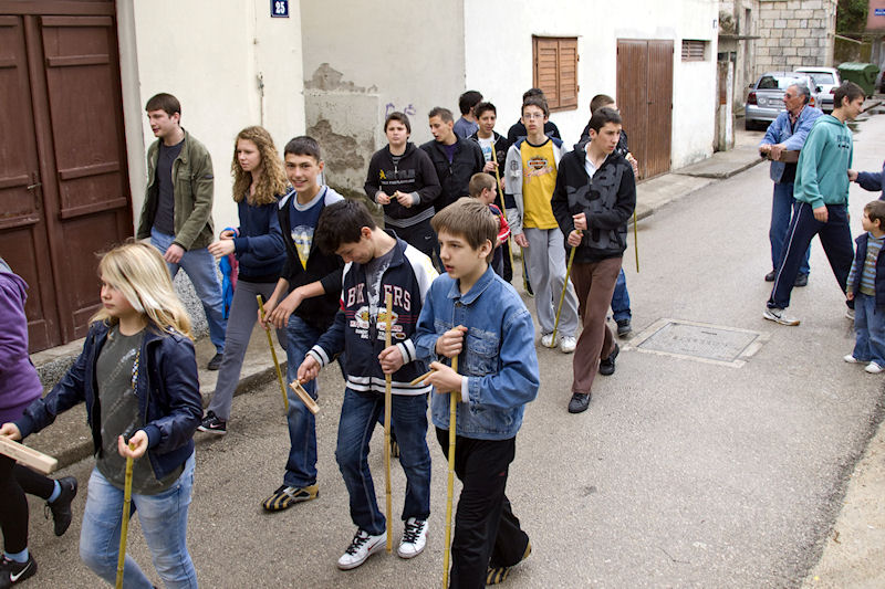 Metković, 7.4.2012. - Danas smo u starom dijelu Metkovića zatekli osamdesetak djece predvođenih Ferdom Jakićem i Vinkom Vukovićem Liskom što su bambusovim štapovima lupali o tlo i proizvodili buku okretanjem čevtralja, kako se drvene čegrtaljke ili štropotaljke kod nas zovu. Radi se o starome običaju koji u različitim krajevima nosi različito ime, a u Dalmaciji je poznat kao baraban.