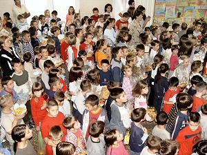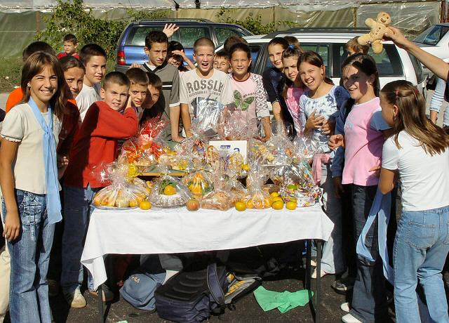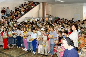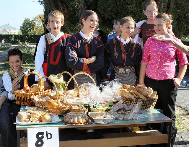 Metković, 22.10.2004. - Danas su u metkovskim školama održane tradicionalne svečanosti povodom Dana kruha. Ovaj dan se naročito obilježio u dvjema osnovnim školama jer su na proslavi sudjelovali gotovo svi učenici. Osnovna škola Stjepana Radića organizirala je prigodan program sa blagoslovom kruha, dok je u OŠ Don Mihovila Pavlinovića upriličena prodajna izložba kruha i peciva kojeg su ispekle vrijedne ruke učenika i njihovih roditelja. Oko tisuću učenika, podijeljenih po razredima, izložilo je svoje pekarske uratke, a sav prihod od prodaje namijenjen je izgradnji crkve i pastoralnog centra O. Ante Gabrića u Metkoviću.