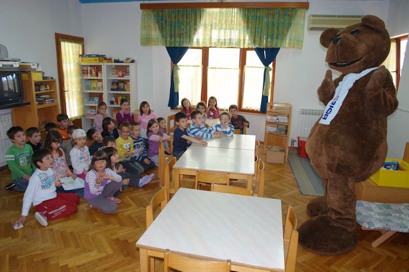 Tijekom kraćeg programa Medo Štedo je s djecom razgovarao o štednji, darovao ih bombonima i šarenim balonima, a djeca su mu za uzvrat otpjevala nekoliko pjesmica nakon čega su svi zajedno i zaplesali.