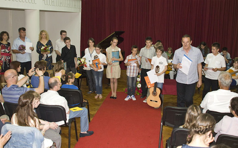Na početku koncerta prisutne je pozdravio ravnatelj Zvonko Knežević koji je rekao kako se završnim koncertom kao i obično zaključuje nastavna godina te kako će tijekom večeri svoje umijeće pokazati najuspješniji učenici škole. Tom prigodom istaknuo je kako „među uspješnima ima i onih još uspješnijih“ misleći na učenike koji su Školu predstavljali na regionalnom, državnom i međunarodnim natjecanjima. Zahvalivši i čestitavši učenicima i njihovim učiteljima na trudu i zalaganju Knežević im je podijelio diplome i priznanja. Posebno je pohvalio učenika završnog, 6. razreda Antu Šiljega koji je u protekloj školskoj godini sudjelovao na tri natjecanja na kojima je ostvario zavidne rezultate te njegovu učiteljicu saksofona Ernu Čizmić – Rebić.