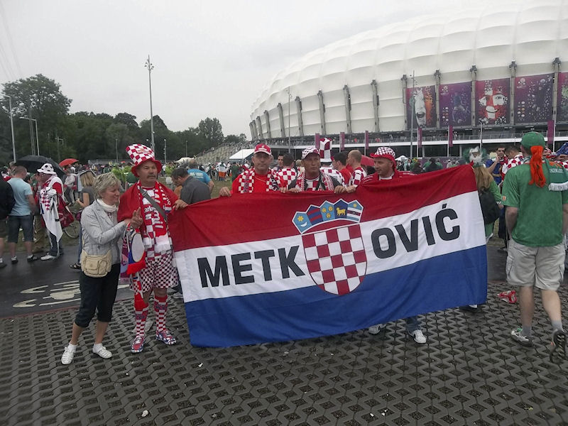 14.6.2012. - Da se Metkovcima teško sakriti, pa makar otišli i na kraj svijeta pokazalo se na kraju utakmice Hrvatska – Irska kada smo već otupjeli od nagomilanog adrenalina krajičkom oka na ekranu uhvatili nekoliko poznatih lica. Tko je sve otišao put Poljske i je li istina da je čak i jedan autobus pun navijača otputovao iz Metkovića bodriti Vatrene nismo doznali. Ono što sa sigurnošću možemo reći, a o čemu svjedoči i fotografija koju nam je uputio Tihomir Bubalo, na utakmici Hrvatska – Irska navijačkom ludilu priključila se i ova mala, ali sigurno glasna skupina.