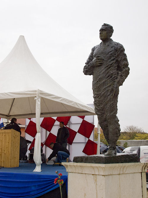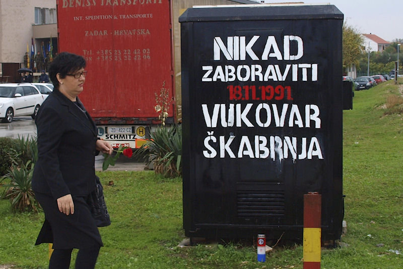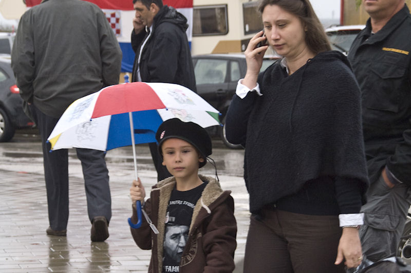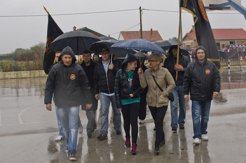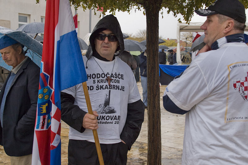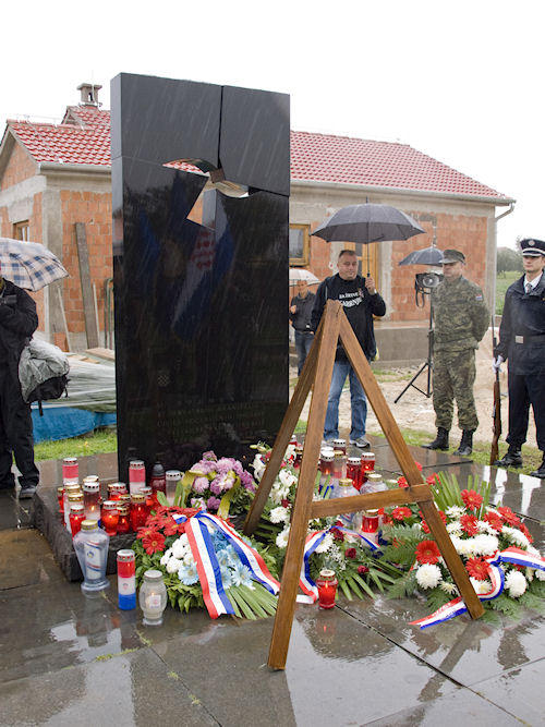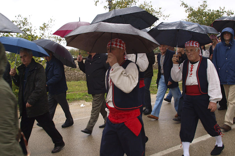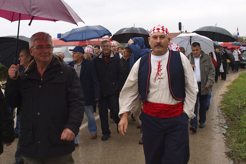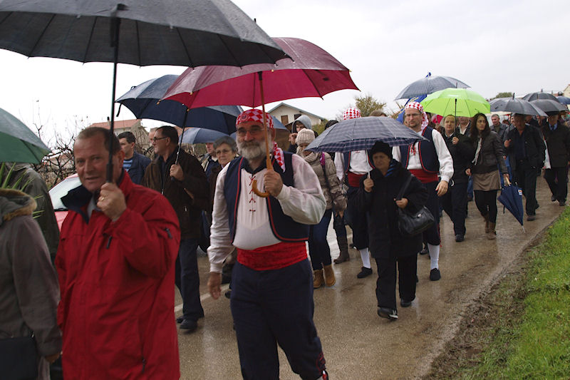 Kiša ne prestaje. Lađari se presvlače u svoje odore, na čemu im ni najmanje ne zavidimo jer nisu baš prilagođene vremenu. Ulazim u crkvu i slikavam drveni kip Majke Božje kako drži Sina. Oboje su bez glave. To je sve što je ostalo iz stare crkve. Za to vrijeme već se priprema mimohod prema masovnoj grobnici usred sela. Inače, obilježja masovnih grobnica u Hrvatskoj svugdje su ista: velika mramorna ploča s prorezom koji izgleda kao golubica, što je znak mira. Baš kao i na Ovčari. U koloni je i ministar Kotromanović. Onako visok, krakat izaziva pozornost. Vijenac pred spomenikom polažu sami Škabrnjani. Ostali se samo poklanjaju mrtvima.