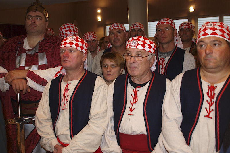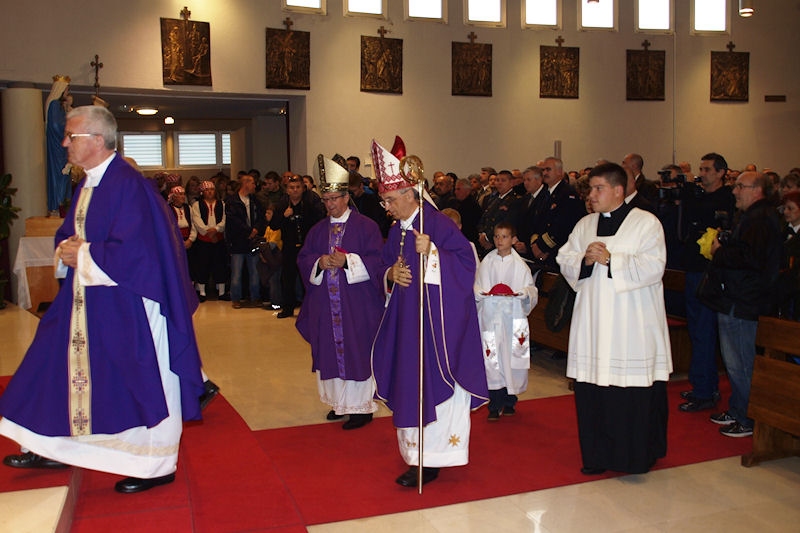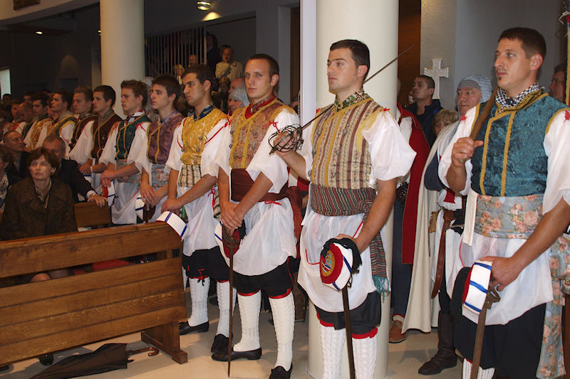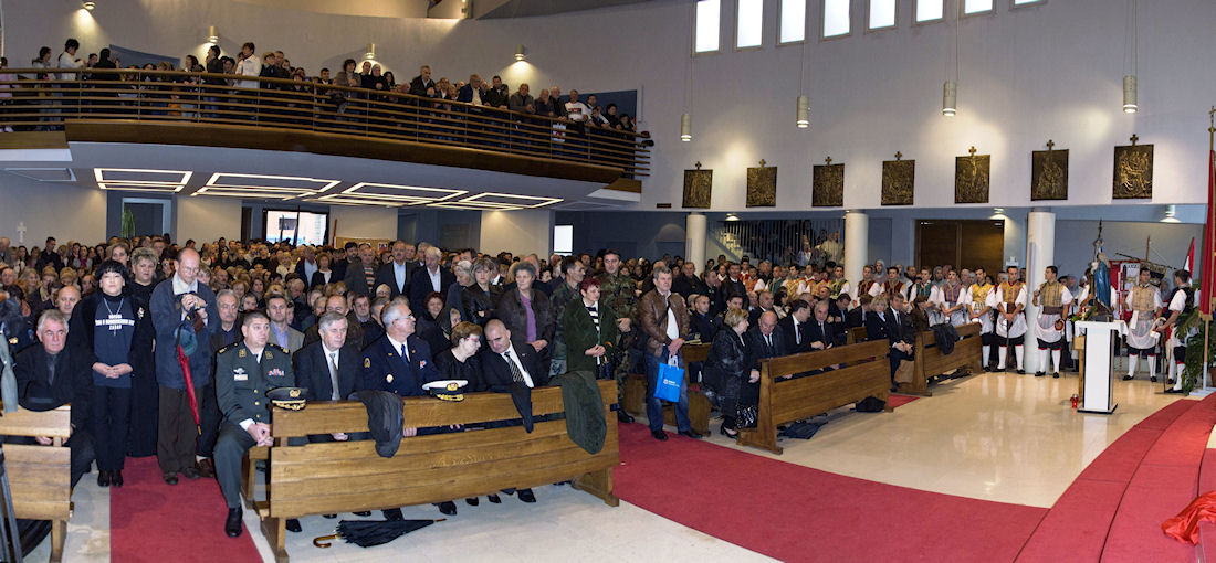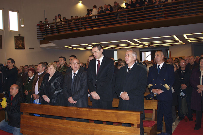 Kolona se vraća prema crkvi u kojoj će zadarski nadbiskup Želimir Puljić predvoditi svetu misu. Crva je ispunjena do zadnjega mjesta pa su mnogi, unatoč kiši, ostali pred njom. Desno od oltara fotografiram naše lađare.