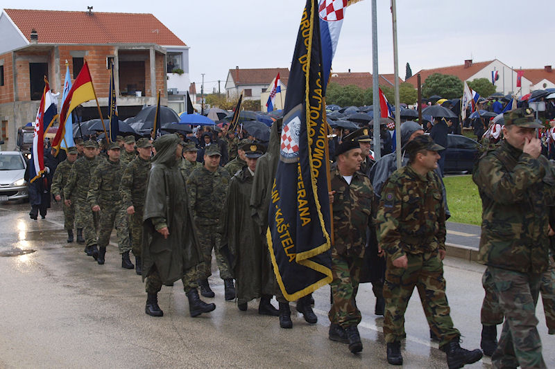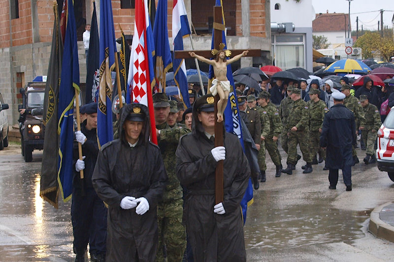 Oblikuje se kolona na čijem čelu hrvatski vojnik nosi raspelo. Podsjetilo me to na vrijeme provedeno u JNA u Somboru. Odredilo me za desetara, na što sam pristao jer mi je ostajanje u Somboru bilo prihvatljivije od nastavka službe na Kosovu ili u Makedoniji. Sjećam se našega majora koji bi svako malo okupio nas starešine i svoj govor redovito počinjao ovako: „Drugovi, crkva je u ofanzivi...“
