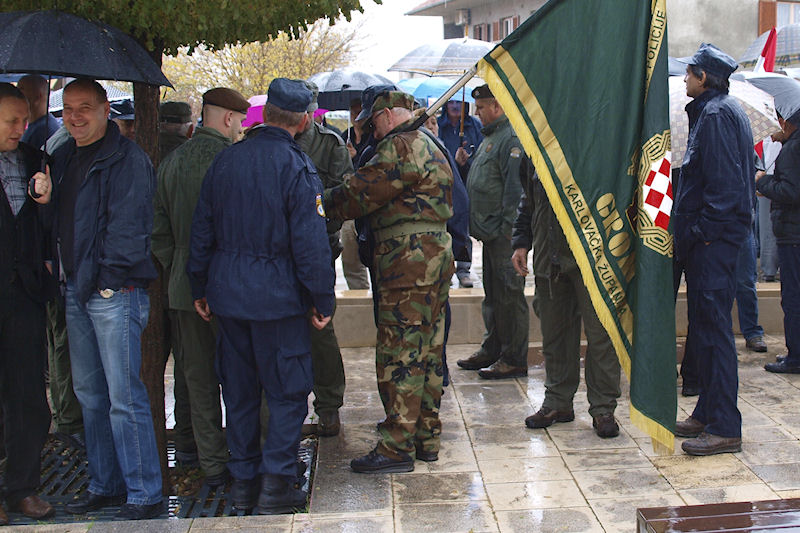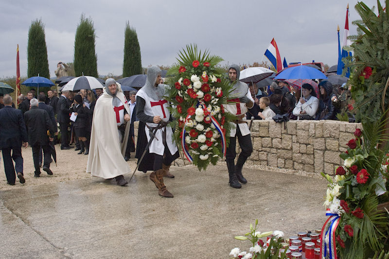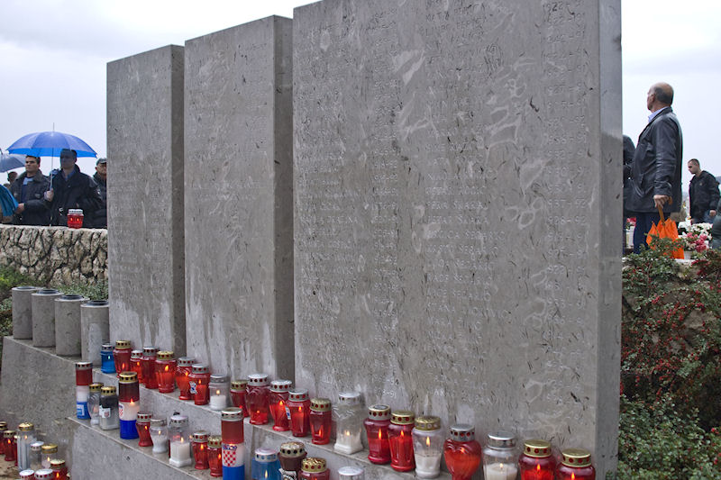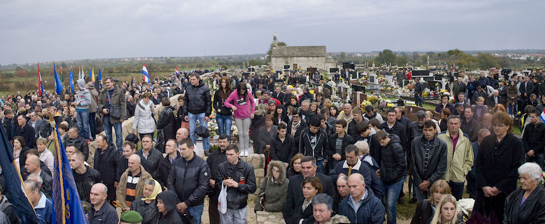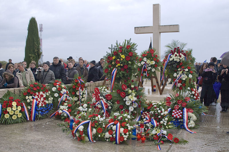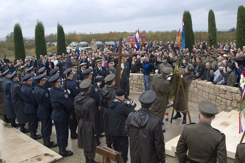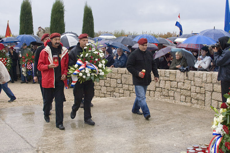Uz zvonjavu škabrnjskih zvona tužna se kolona uputila do nekoliko kilometara udaljena mjesnoga Groblja sv. Luke na kojemu je veliki križ i ploča s uklesanim imenima svih stradalnika. Prioritet ima protokolarno polaganje vijenaca. Izmjenjuju se svi, od ministra pa nadalje. Tu su i nebrojene udruge, među njima i naši iz Četvrte te lađari.