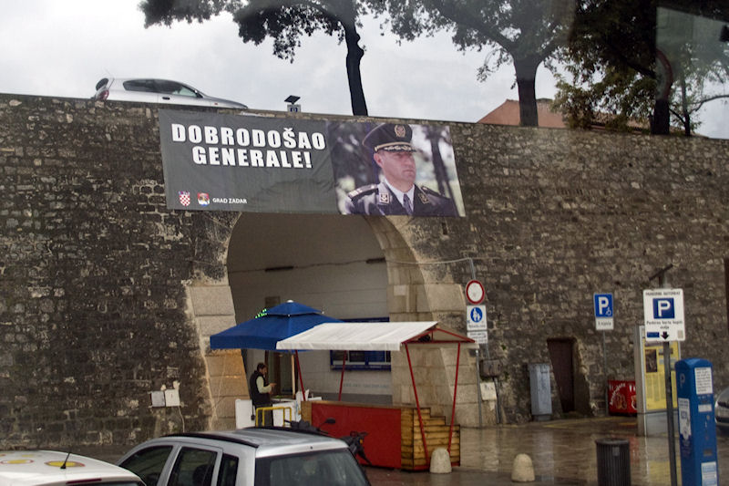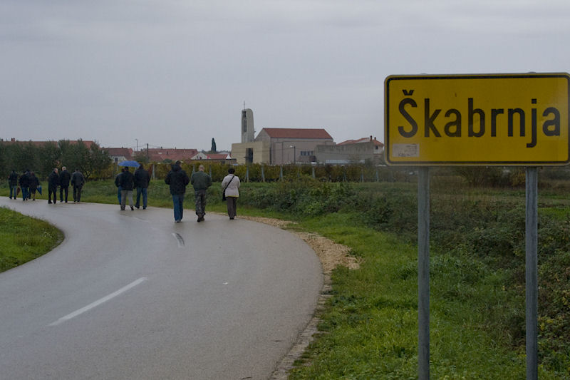 Nadu da će kiša, ipak, prestati padati izgubili smo tijekom vožnje, a naročito kada smo pred silaskom s autoceste zastali na odmorištu Nadin. Nebo je bivalo sve crnje, kao da se i ono htjelo pridružiti sjećanju na tužan događaj od prije 21 godinu. Autobus s Kalmetine skreće prema Škabrnji. Već na ulazu u selo vidimo transparent sprejem ispisan na komadu lancuna. Piše: „Škabrnja sad živi“. Malo dalje je raspelo pod kojim piše „Bože čuvaj Škabrnju“. I treba je čuvati, jer nije stradala samo u Domovinskome ratu. Ožiljke nosi još iz Drugoga svjetskoga rata, ali tko će sada još i o tome, kada nove rane potiskuju stare.