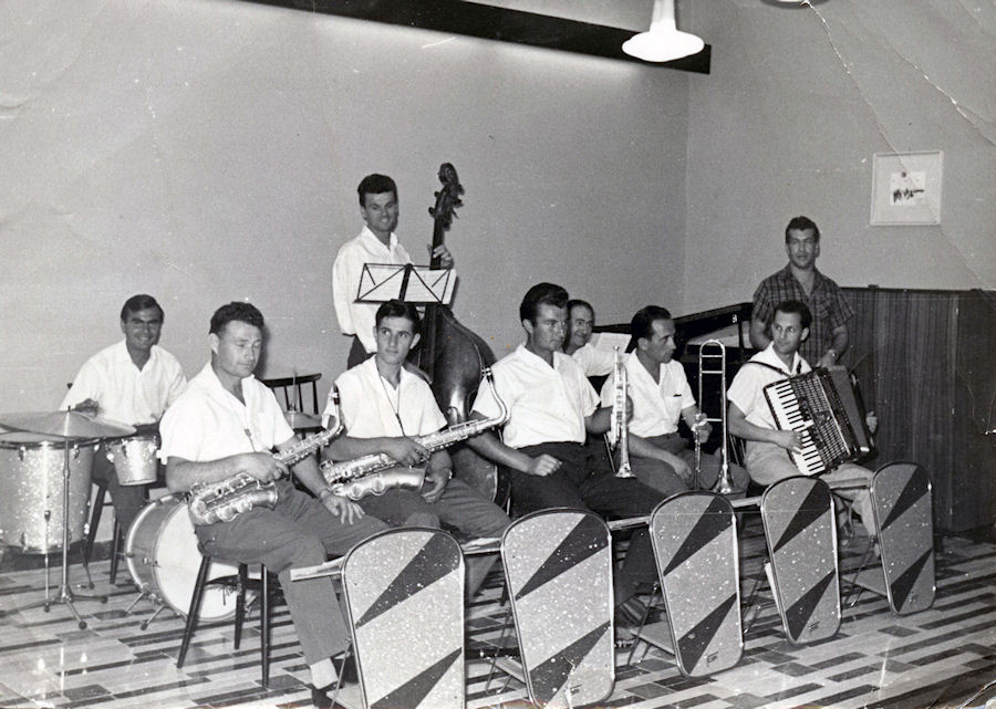 Na prvoj fotografiji od 1. svibnja 1957. je džez orkestar snimljen, pretpostavljamo, u Hotelu Zagreb (danas Narona) u Metkoviću. S lijeva nadesno su: Pavo Volarević (alt saksofon), Viktorija Obrvan (pjevačica), Tonći Damić (klavir), Ivo Medić (truba), Mladen Scipioni (harmonika) i Ante Jelčić – Kljopak (bubnjevi).
