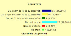 Dok ovo pišemo (8 sati) prerano je govoriti o izlaznosti. Zato imamo noćas zaključenu anketu na kojoj je samo 29% ispitanih izjavilo da će izaći na izbore. Njih 15% zna za koga će glasovati, 9% će odlučiti na samome biralištu, a 8% će namjerno krivo glasovati. 37% ispitanih izjavilo je da ih izbori ne zanimaju, a 8% je odlučilo da neće na izbore iz protesta. Mišljenje o svemu tome nema 4% ispitanih.