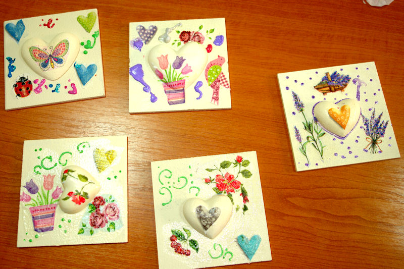 Za radionicu su korisnici Dnevnog boravka pripremili pločice sa srcima od gipsa, a tijekom radionice djeca su ih prema vlastitim željama ukrašavali salvetnom tehnikom. Mali umjetnici su strpljivo, uz pomoć raznovrsnih salveta te uz malu pomoć kistova, specijalnih boja i perlica, napravili kreativne i maštovite uratke koje su ponijeli na dar svojim mamama. Na kraju druženja djeca su korisnicima prigodno recitirala pjesme čija je tema bila majka.