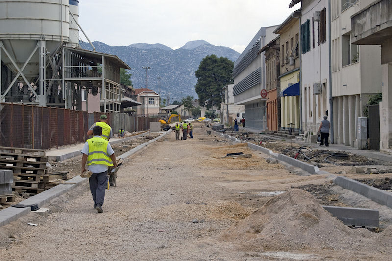 Mada se prema donjoj fotografiji ne čini tako, uskoro bi pod asfalt trebala i Hebrangova ulica. Bit će dovršen nogostup uz lučki prostor i asfaltirana parkirna mjesta, dok će nogostup uz zgrade biti dovršen tek kada se izvedu novi priključci za vodu.