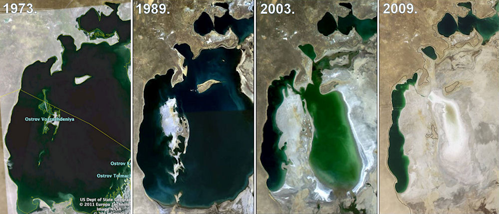 Pisali smo tada i o slučaju slanoga Aralskoga jezera (mora) koje je gotovo nestalo nesavjesnim ljudskim djelovanjem. Nekada je imalo površinu od 68 000 četvornih kilometara (Jadransko more ima 138 600 četvornih kilometara). Razlog svemu je pamuk, kultura, a kasnije i sirovina koja za uzgoj i preradu treba enormne količine vode. O tome piše i tportal.hr. Tako, kupujući jeftine majice plaćamo skupu cijenu. Neki stručnjaci tvrde da je nestanak Aralskoga jezera jedan od razloga globalnih klimatskih promjena jer sada hladni sibirski vjetrovi prodiru dublje na jug. Obrnut utjecaj imaju umjetne akumulacije koje okolnom području mijenjaju mikroklimu pa su zime blaže, što pospješuje razmnožavanje štetnih glodavca, a mijenja se i vegetacija.