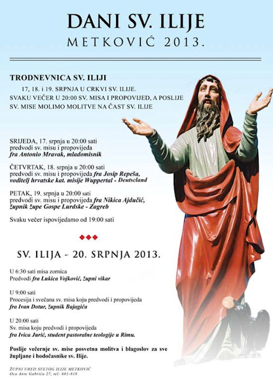 Uoči Sv. Ilije, 19. srpnja u Gradskom kulturnom središtu u 19 sati otvorit će se izložba slika Mladena Veže, a u 20 sati započet će Svečana sjednica Gradskoga vijeća grada Metkovića, na kojoj će biti dodijeljena javna priznanja, tj. Nagrade Grada Metkovića. U 21 sat na Trgu kralja Tomislava nastupit će grupa Narona.