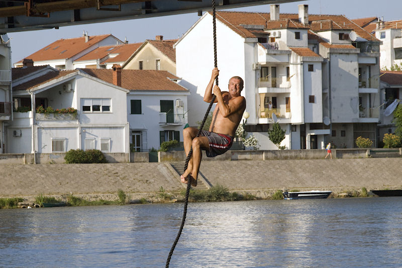 Luka Obradović je za nepunih 29 sekunda uspio doplivati do konopa koji je visio s mosta i uspeti se uza nj. Za to je osvoji pršut, dar firme Kulina.
