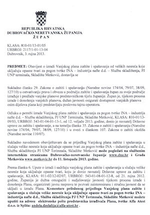 - Obavijest o izradi Vanjskog plana zaštite i spašavanja od velikih nesreća koje uključuju opasne tvari za pogon tvrtke INA – industrija nafte d.d., PJ UNP terminala, Metković (kliknite na sliku dolje)