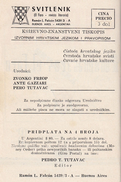 … Pokušao je nastaviti život u Čileu. Vraća se u Argentinu i nastanjuje u Mendozi godine 1949. Odmah se uključuje u domobranski ogranak “Zrinski i Frankopan”, najprije kao član. Ubrzo je izabran za tajnika ogranka. Godine 1954. izdaje brošuru o radu domobrana u Mendozi. Pokreće nezavisne novine “Napredak” na kasteljanskom jeziku i esperantu. Zauzima se za pisanje ikavicom “kao jedinim pravim i čistim hrvatskim jezikom” — kako sam kaže. Kratko je živio i u Urugvaju. Iz Urugvaja odlazi u Buenos Aires i opet izdaje list “Napridak”.