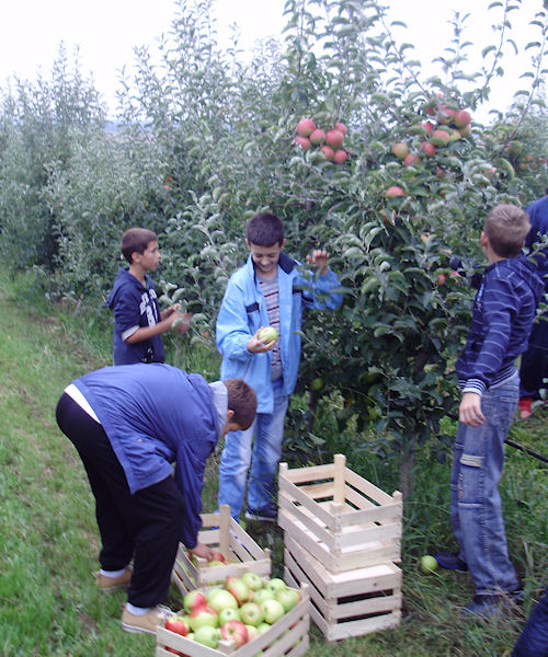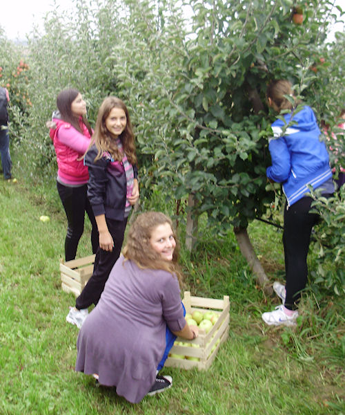 Nakon svečana prijma u Školi, razmjene pozdrava i darova te ručka, učenici su krenuli u berbu jabuka u velikom voćnjaku s oko 1100 stabala, koji se nalazi u krugu škole. Zadrugari UZ Jabuka ispričali su im nešto svome o voćnjaku, kako ga održavaju, koji se sve poslovi u njemu obavljaju te način branja jabuka.