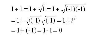Jednom smo u trećemu razredu gimnazije htjeli ispasti pametni pa smo pok. prof. Mići Martiću podmetnuli „dokaz“ da jedan i jedan, odnosno jedan plus jedan nisu dva nego nula. Martić je na ploči pogledao naš izvod „dokaza“ i rekao da je sve naoko dobro postavljeno, ali da svaki pozitivan broj ima dva korijena, jedan pozitivan, a drugi negativan pa je naš „dokaz“ pao već na prvome koraku.
