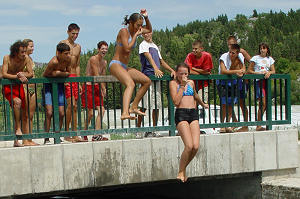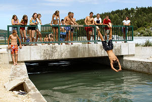 U ljetnim mjesecima kanal je pun čiste hladne vode pa je postao omiljeno kupalište djeci sa područja Vrbovaca kojih se tamo skupi na desetke. Početno nepovjerenje prema strancu koji ih želi slikati brzo je nestalo pa je uslijedila serija skokova. Jedan od njih bio je čak i sa biciklom, no nespremni fotoreporter nije ga registrirao. Momci skaču "na glavu"... ... a cure "na noge".