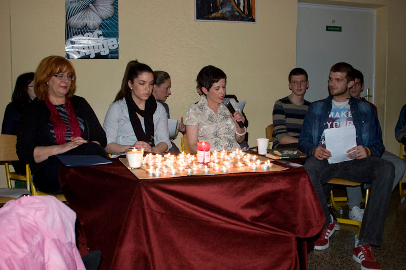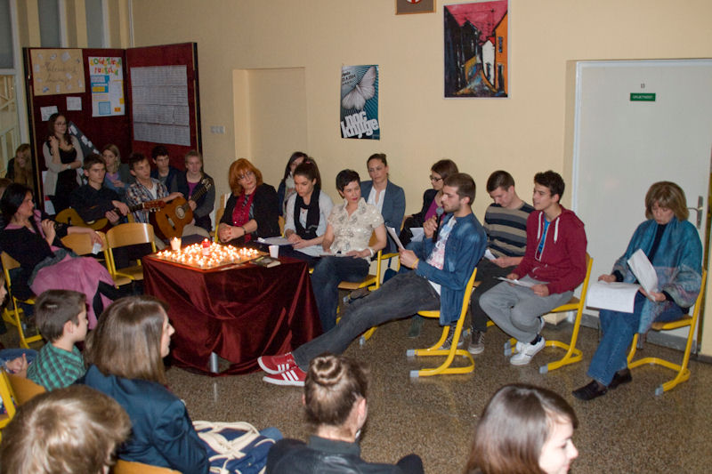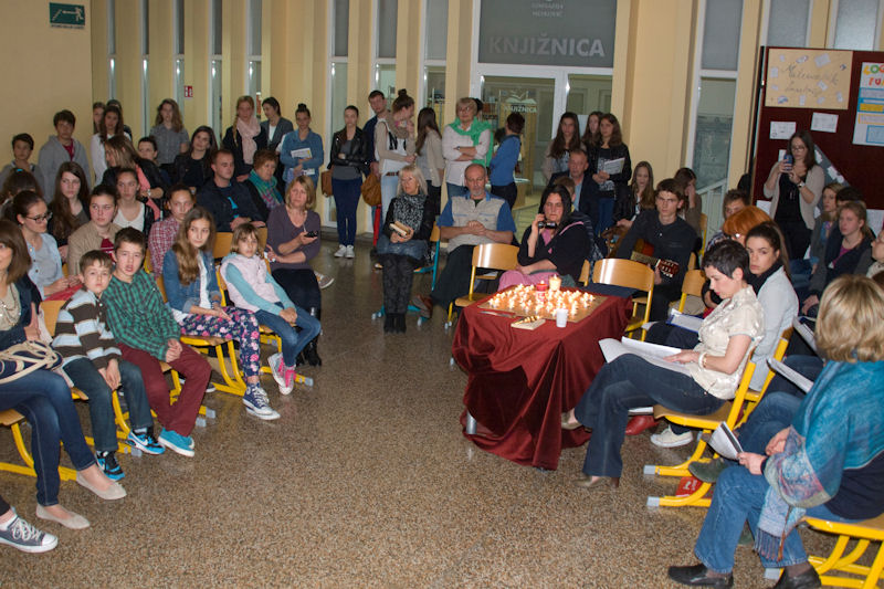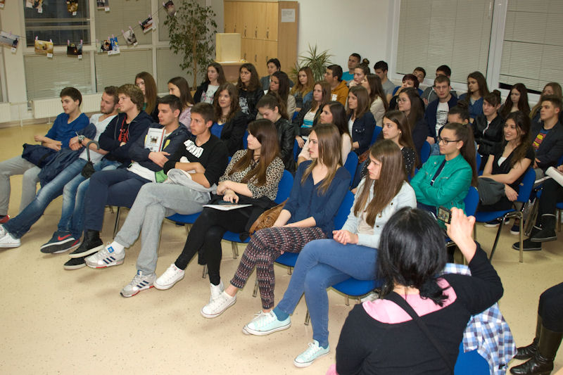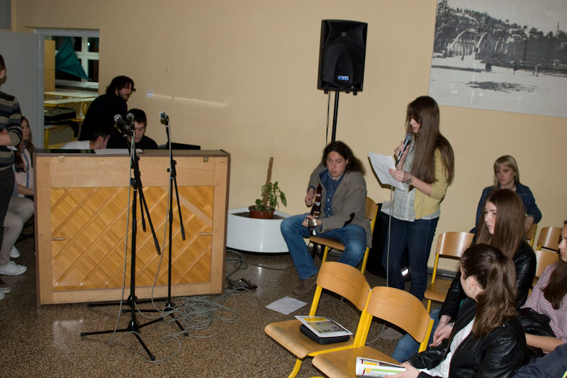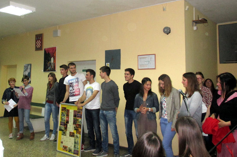 Gimnazija Metković Program je u Gimnaziji započeo otvaranjem izložbe učeničkih fotografija Čitam – čitaš i tzv. Happy hourom – povratom knjiga uz oprost zakasnine. Potom je predstavljena zbirka oslikanih bajki zajedničkog imena Alle Leute lachen in der gleichen Sprache (Svi se ljudi smiju na istom jeziku). To je zbirka koja se sastoji od 16 ilustriranih priča i bajki što su ih osmislili učenici Gimnazije Metković na radionicama projekta na njemačkome jeziku Moja prva slikovnica pod vodstvom prof. Svjetlane Bebić. Predstavljanje je pratio školski sastav koji je izvodio pjesme na njemačkome jeziku. Svim učenicima koji su sudjelovali u ovogodišnjem njemačko-hrvatskom mjuziklu Der Wolf und die seibene Geißler (Vuk i sedam kozlića) darovana je po slikovnica s DVD-om, koja je izrađena prema njihovoj interpretaciji tē poznate bajke. Jedan primjerak darovan je i školskoj knjižnici. Nakon plesne točke Knjiga predstavljeni su rezultati projekta Zrak u dolini Neretve što su ga proveli učenici pod mentorstvom prof. Marije Volarević i prof. Svjetlane Bebić. U Poetskome kolažu europskih jezika nastupili su profesori, učenici i bivši učenici Gimnazije koji su u izvorniku čitali pjesme poznatih svjetskih pjesnika. Tako se moglo čuti kako u originalu te pjesme zvuče na ruskom, španjolskom, portugalskom, francuskom, talijanskom, češkom, njemačkom i engleskom jeziku. Sve je to glazbom pratio gimnazijski sastav s Milanom Kapovićem. Nakon glazbenog predaha uz gitaru izveden je program Notturno uz Matoša, posvećen stotoj obljetnici smrti toga najhrvatskijega pjesnika.