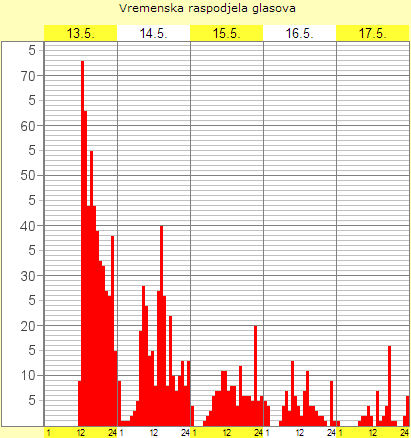 Inače, naše su ankete napravljene tako da destimuliraju navijačko glasovanje kako bismo došli do što vjerodostojnijih podataka. Prije odgovora na pitanje treba proći lokalpatriotsko kvz-pitanje, što odnosi neko vrijeme i umanjuje lobiranje preko društvenih mreža. Dodatna zaštita je preko praćenja IP adrese i „kolačića“. Najbolji dokaz da su sve te mjere relativno učinkovite jest grafikon vremenske raspodjele glasovanja.