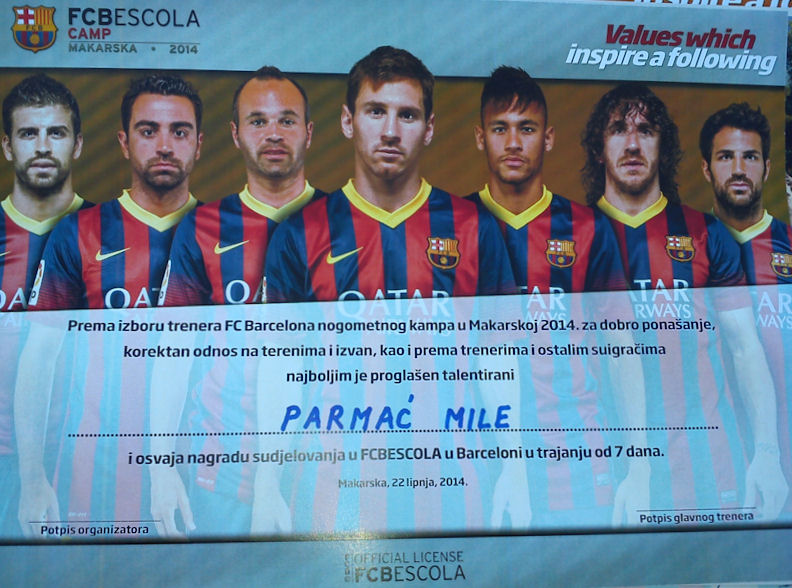 24.6.2014. - U nedjelju je u Makarskoj završen nogometni kamp FC Barcelona koji se od 18. lipnja održavao na nogometnim terenima NK Zmaj u organizaciji tvrtke Culmena d.o.o. koja je nositelj regionalne licence za FB Barcelona kampove. Tijekom petodnevnih treninga više od stotinu nadarenih dječaka iz cijele Hrvatske u dobi od 6 do 17 godina imalo je priliku pokazati svoj talent. Među polaznicima je bio i osmogodišnji Metkovac Mile Parmać koji je prema ocjeni četvorice španjolskih trenera bio jedan od dvojice najboljih polaznika kampa pa će sedam dana biti gostom FC Barcelona. Svoj uspjeh na završnoj svečanosti Mile je jednostavno prokomentirao: „Ostvario mi se san, igrati za Metković, Hajduk i Barcelonu!“