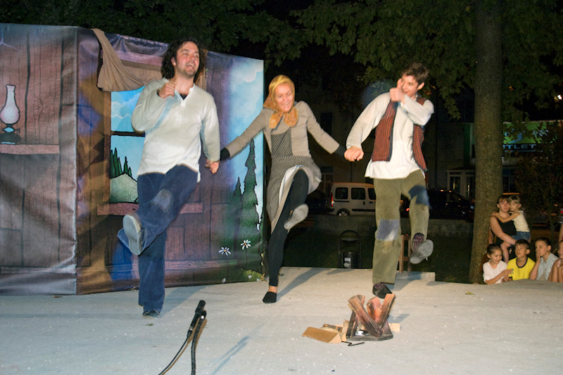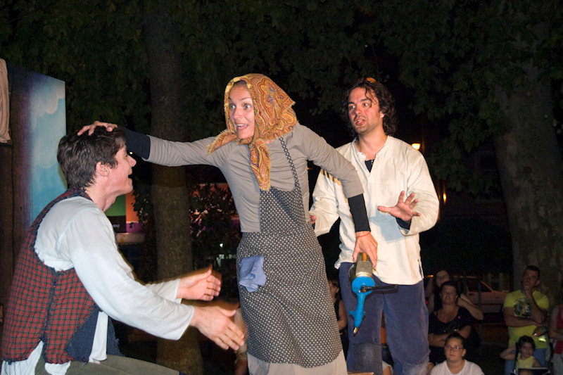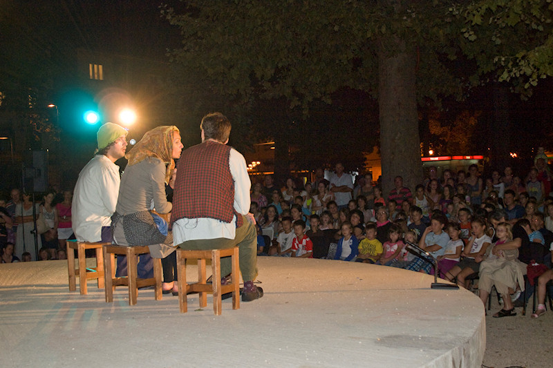 23.7.2014. - Potjeh, Ljutiša i baka te Svarožić i dva Bjesomara sinoć su u Gradskome parku u Metkoviću oduševili preko dvije stotine djece, od koje su mnoga došla u pratnji roditelja ili baka i djedova. Riječ je o adaptaciji poznate priče iz davnine Kako je Potjeh tražio istinu koju su u kazališnoj predstavi uprizorili glumci Kazališta Merlin iz Zagreba.