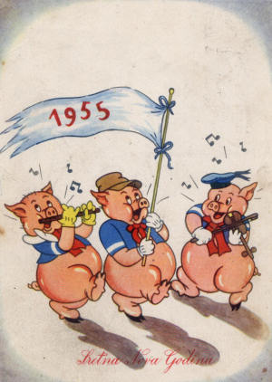 Od 21. prosinca o.g. do 10. siječnja 2006. u auli GKS-a bit će postavljena zanimljiva izložba starih božićnih i novogodišnjih čestitaka među kojima su i neke iz 19. stoljeća. Zanimljivo je vidjeti kako su se čestitke mijenjale vremenom, i nabolje i nagore, te kao je nekada pisanje čestitke zahtijevalo vremena i imalo dušu. Jedna od najkvalitetnijih čestitaka, dodatno ukrašena suhim reljefnim tiskom, otkriva i kvalitetno naličje (detalj dolje). Božićna čestitka sa motivom u kojem nema ni traga onome u što su se pretvorili božićni blagdani. Pokušaj zamjene Božića Novom godinom iz 1955. Tri sretna odojka jedva čekaju da im stave jabuke u usta. Na poleđini čestitke očita je zbunjenost pošiljatelja koji je nakon naslova 'Cienjena Gospođa' naknadno dopisao i 'Drugarica', zlu ne trebalo.