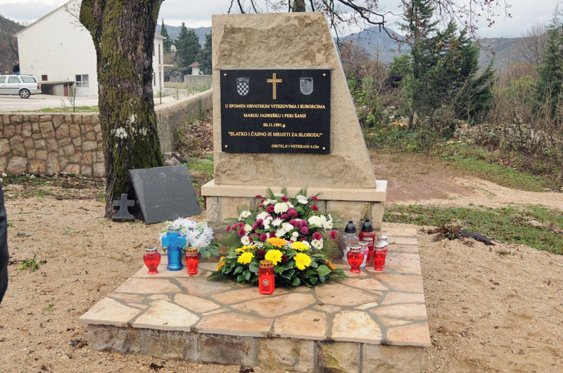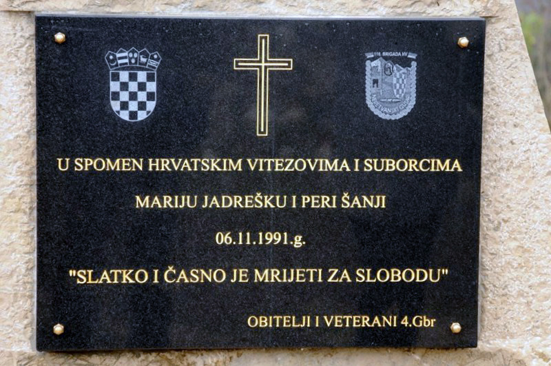 8.12.2014. - Jučer je u Trebimlji pokraj Ravnoga u Popovu polju, uz župnu crkvu Uznesenja Blažene Djevice Marije u središtu mjesta otkriven novouređeni spomenik pokojnima Mariju Jadrešku i Peri Šanji, poginulim hrvatskim braniteljima i pripadnicima 116. brigade HV-a.