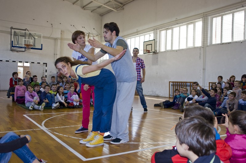Spomenuta predstava je interaktivno-plesni program koji su osmislile Larisa Navojec i Tamara Curić, a uz njih predstavu izvode glumci Zoran Pribičević i Petar Cvirn. Koristeći okvir poznate dječje priče o tri praščića, predstava govori o kreativnosti, zajedništvu, lijenosti, nespretnosti, prijateljstvu. Zanimljiva predstava razveselila je prisutne školarce, a prema onome što se nakon nje moglo vidjeti na radionici potaknula ih je na izražavanje svojih sposobnosti, ali na drugačiji način od onoga uobičajenoga.