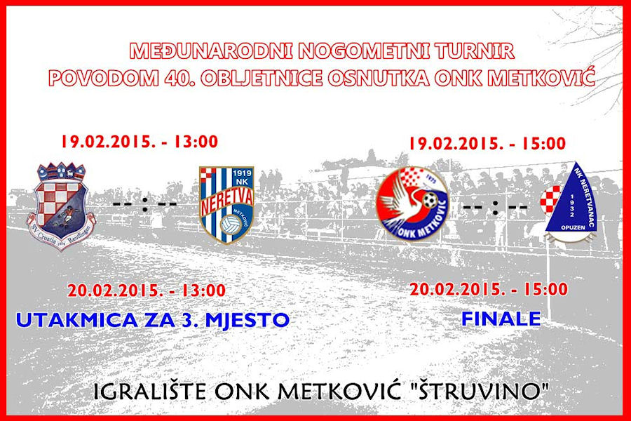 18.2.2015. - Ove godine metkovski ONK Metković proslavlja 40. obljetnicu svoga osnutka. Tim povodom će se sutra i prekosutra (19. i 20. veljače) na Igralištu ONK Metković (popularnom Štruvinom) odigrati Međunarodni nogometni turnir.