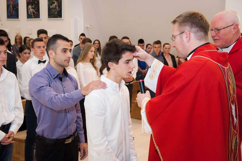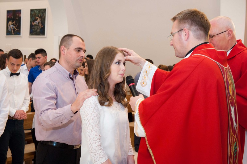 4.5.2015. - U subotu je u župnoj crkvi sv. Nikole Biskupa šezdeset dvoje krizmanika primilo sakrament svete krizme što im ju je podijelio generalni vikar Splitsko-makarske nadbiskupije mons. Miroslav Vidović, koji je u zajedništvu s don Antom Antunovićem i fra Antom Crnčevićem te roditeljima i kumovima krizmanika, kao i ostalim vjernicima predslavio svetu misu. Fotografije nam je ustupio Foto Veraja.