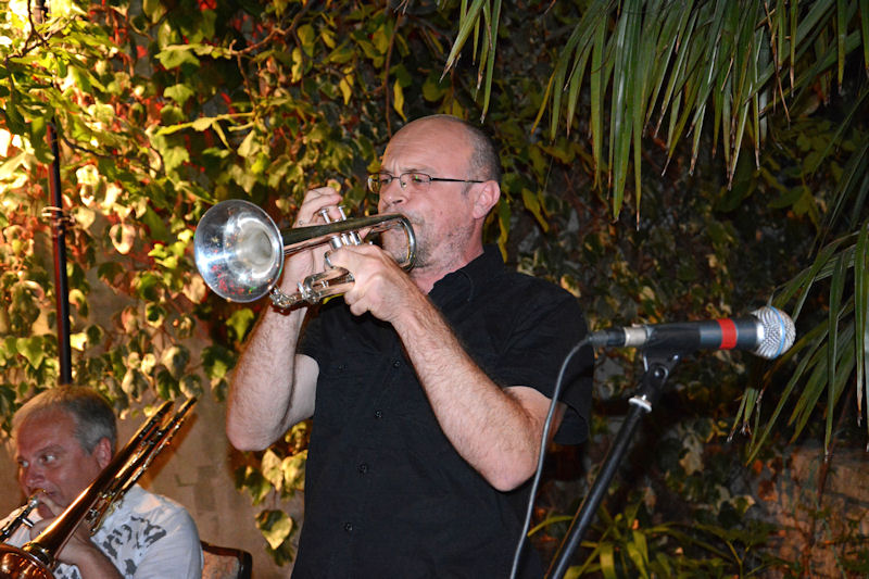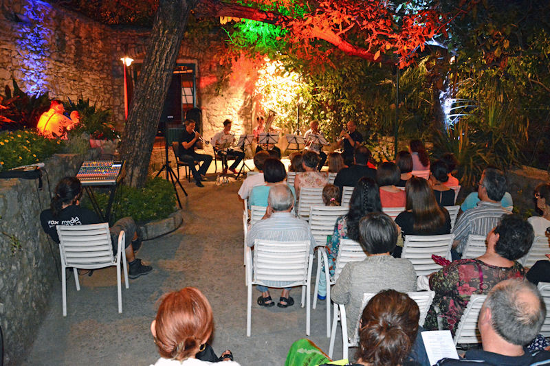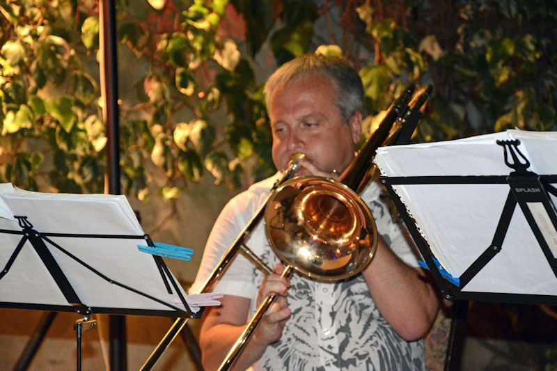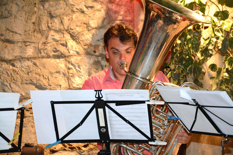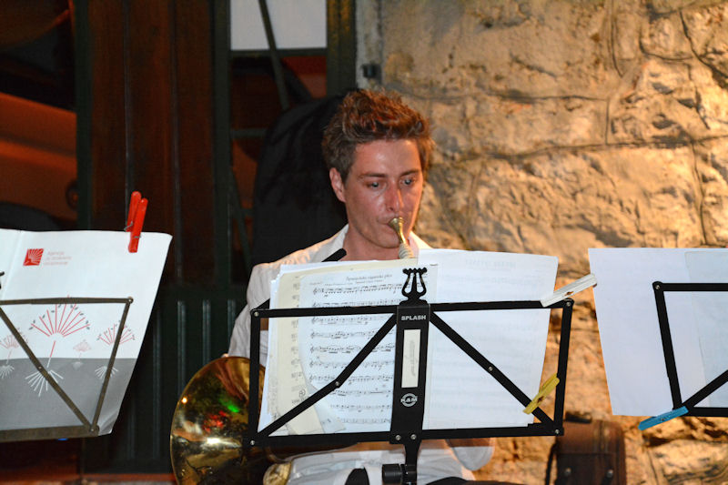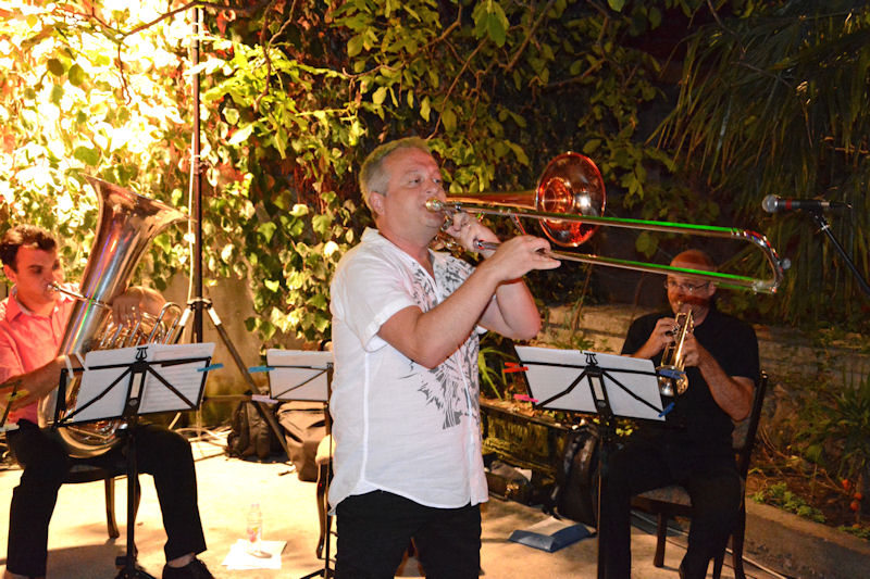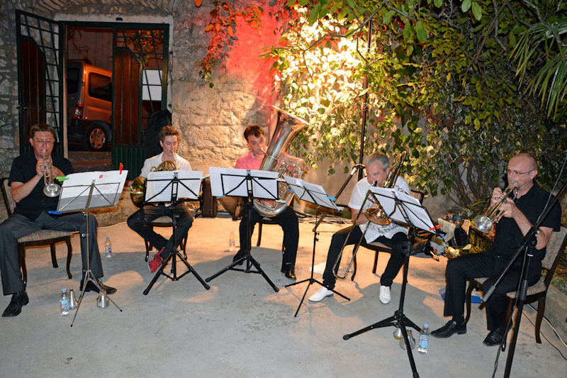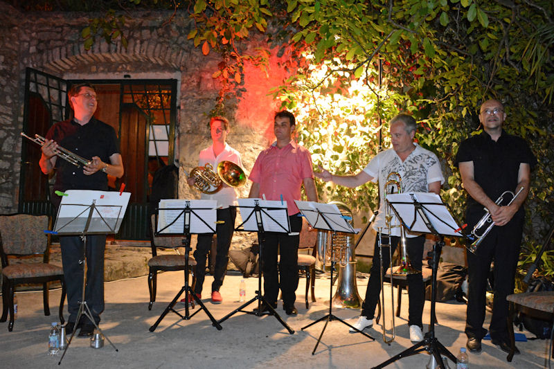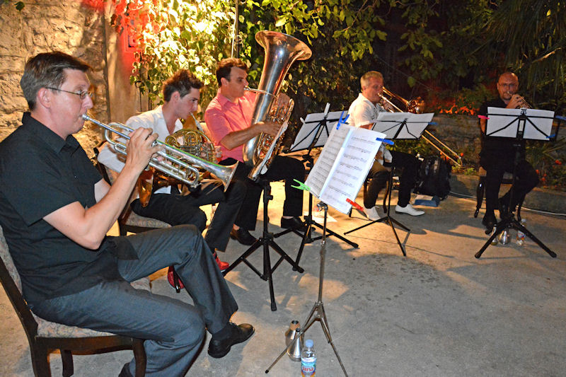 Metković, 18.7.2015. - Nakon vrhunskoga muziciranja što ga je Metkovcima prije desetak dana u Gradskome parku pružio Jazz-orkestar HRT-a, u četvrtak je to u dvorištu obitelji Barbir ponovio puhački kvintet Simply brass.