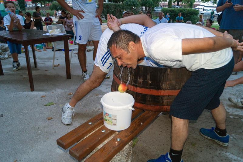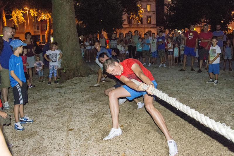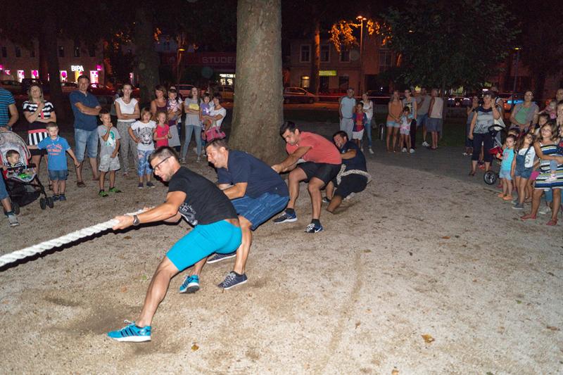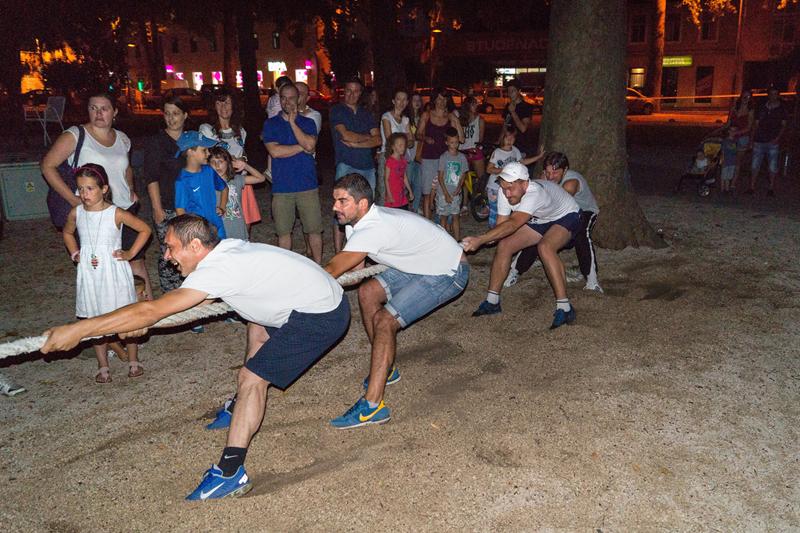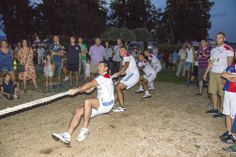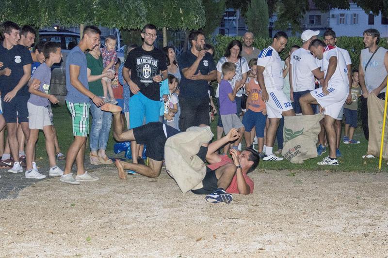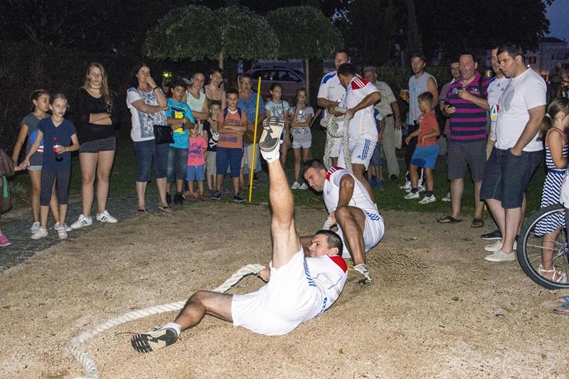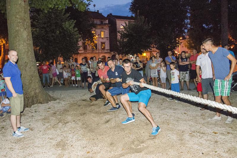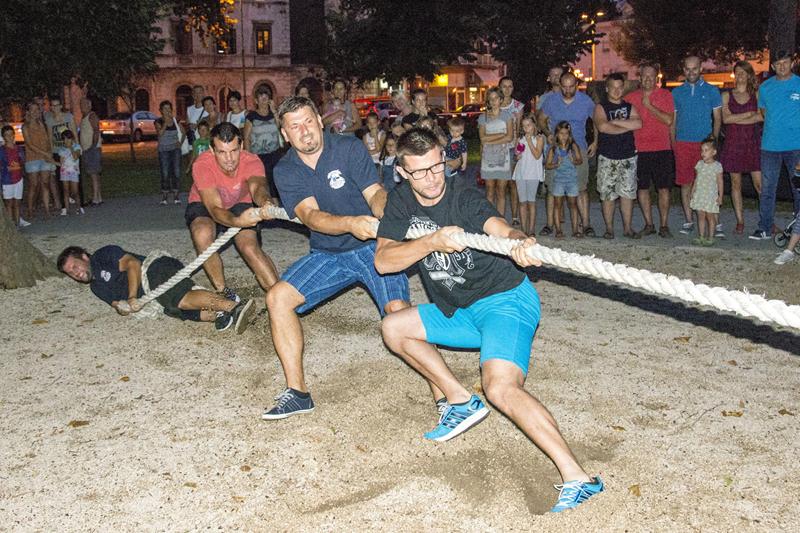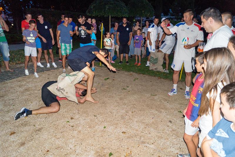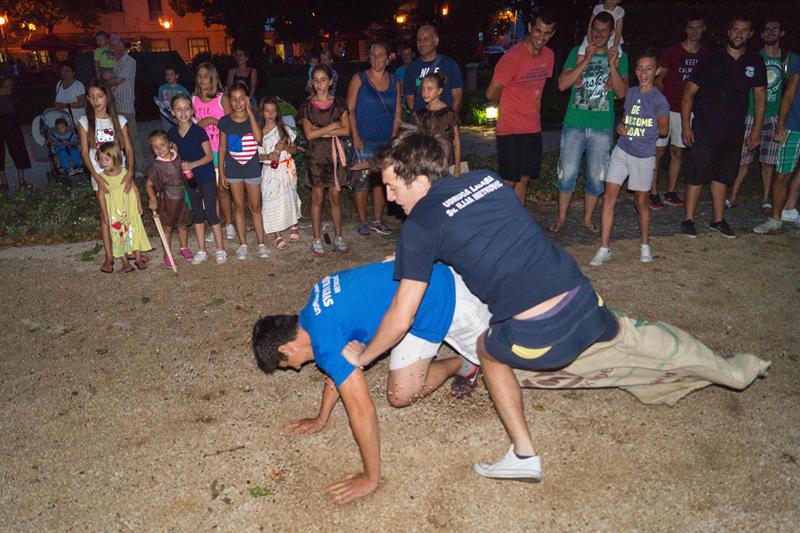 8.8.2015. - Jučer je kiša omela održavanje viteških igara za djecu u Gradskome parku, ali su predvečer održane igre za odrasle, koji su se natjecali i vađenju jabuka iz maštela, obaranju ruke, bacanju potkove, trčanju u vrećama i potezanju konopa.