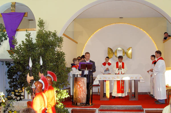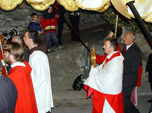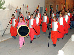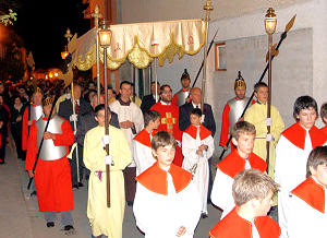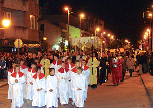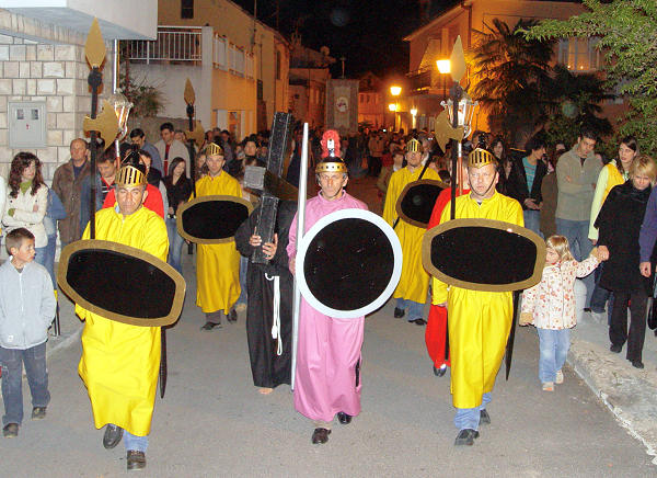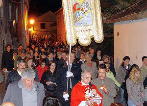 Metković, 15.4.2006. - Obredima Velikog petka i procesijama sinoć se u obje metkovske župe nastavilo obilježavati sjećanje na Muku Isusovu tijekom Svetog trodnevlja. U Župi Sv. Ilije nakon mise krenula je procesija starim dijelom grada u kojoj je sudjelovalo nekoliko tisuća vjernika u pratnji žudija i zbora. Kao i uvijek naročitu pozornost privlačio je Šimun koji bosonog, skrivena lica, nosi teški križ u pratnji žudija šimunaša.