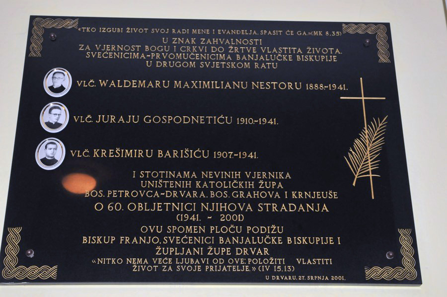 Župa Drvar osnovana je 1906. godine i obuhvaćala je područje Drvara, a 1932. godine sagrađena je crkva sv. Josipa i župna kuća koje su srušene nakon II. svjetskog rata. Jedan od mnogih događaja o kojima se pola stoljeća moralo šutjeti zbio se 27. srpnja 1941. U tzv. ustanku (taj se nadnevak u SR Hrvatskoj slavio kao Dan ustanka) „ustanici“ su presreli vlak u kojemu su bili hodočasnici iz Drvara, na čelu sa župnikom Waldemarom Maksimilijanom Nestorom, na povratku s hodočašća sv. Ani u Kosovu kraj Knina. Putnike katolike izveli su iz vlaka, svezali ih i odveli u mjesto Trubar blizu Drvara te ih sve sa župnikom pobili i bacili u jamu Golubnjaču. Bogoslužje se danas održava u nekadašnjemu Društvenom domu Partizan jer mjesne vlasti opstruiraju dodjelu zemljišta za gradnju nove župne crkve. Danas u Drvaru živi petstotinjak Hrvata, uglavnom doseljenih iz srednje Bosne.