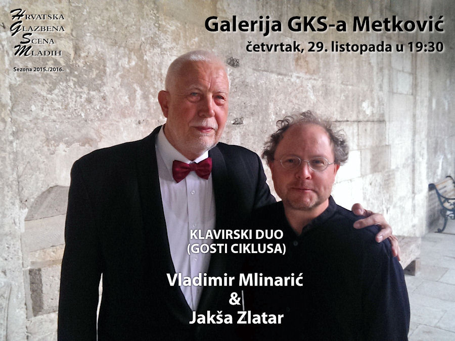 Vladimir Mlinarić, profesor klavira na Akademiji za glasbo u Ljubljani i Jakša Zlatar, profesor klavira i metodike klavira na muzičkim akademijama u Zagrebu i Ljubljani te umjetnički direktor Hrvatske glazbene scene mladih, večeras u 19:30 u Galeriji GKS-a svirat će djela Mauricea Ravela, Claudea Debussyja, Antonína Dvořáka, Sergeja Rahmanjinova i Andreja Missona, koji je za klavirski duo komponirao Smoke on the Water prema temi poznate pjesme grupe Deep Purple.