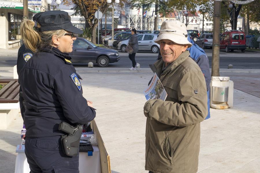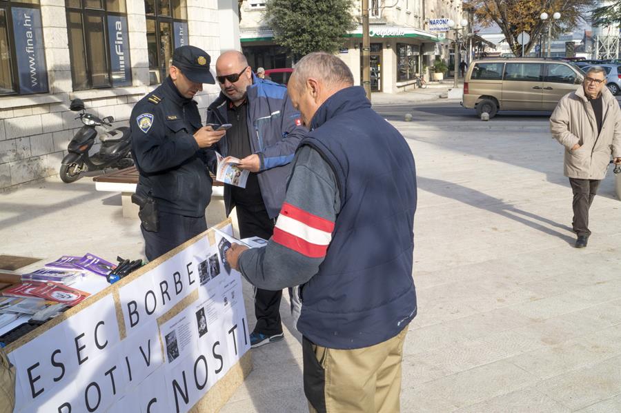 Metković, 14.12.2015. - Danas su na Trgu kralja Tomislava policijski službenici iz PP Metković postavili info-pult povodom Mjeseca borbe protiv ovisnosti te građanima dijele prikladne tiskane materijale. Osim toga, građani se mogu testirati na alkohol i pogledati kroz tzv. pijane naočale koje simuliraju vid vozača pod utjecajem alkohola. Akcija traje do 13 sati.