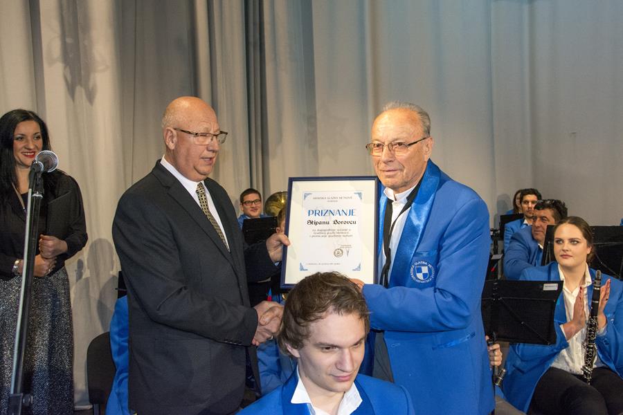 Pred kraj je na pozornicu izašao odnedavni predsjednik Glazbe Pavo Jerković, koji se osvrnuo na slavnu povijest glazbe, ali i najavio njezinu sjajnu budućnost, ponajprije zahvaljujući zanimanju najmlađih da postanu članovima glazbe te dobroj suradnji s Gradom Metkovićem. Jerković je iskoristio prigodu da najstarijem aktivnom članu glazbe Stipanu Borovcu uruči naročito priznanje. Šjor Stipan je zahvalio na duhovit način, rekavši da će mu to priznanje biti poticaj za njegov daljnji rad u Glazbi. Jerković je zahvalio i predao cvijeće gđi Pavlović, koja je prije tri mjeseca privremeno preuzela Glazbu u situaciji kada je ona ostala bez kapelnika, isto kao i gđi Romani Pivac, koja tradicionalno bez naknade vodi Glazbine koncerte. U publici je bio i Stipan Krmić, kojega je predsjednik Jerković predstavio kao novoga kapelnika koji će Glazbu preuzeti od Nove godine.